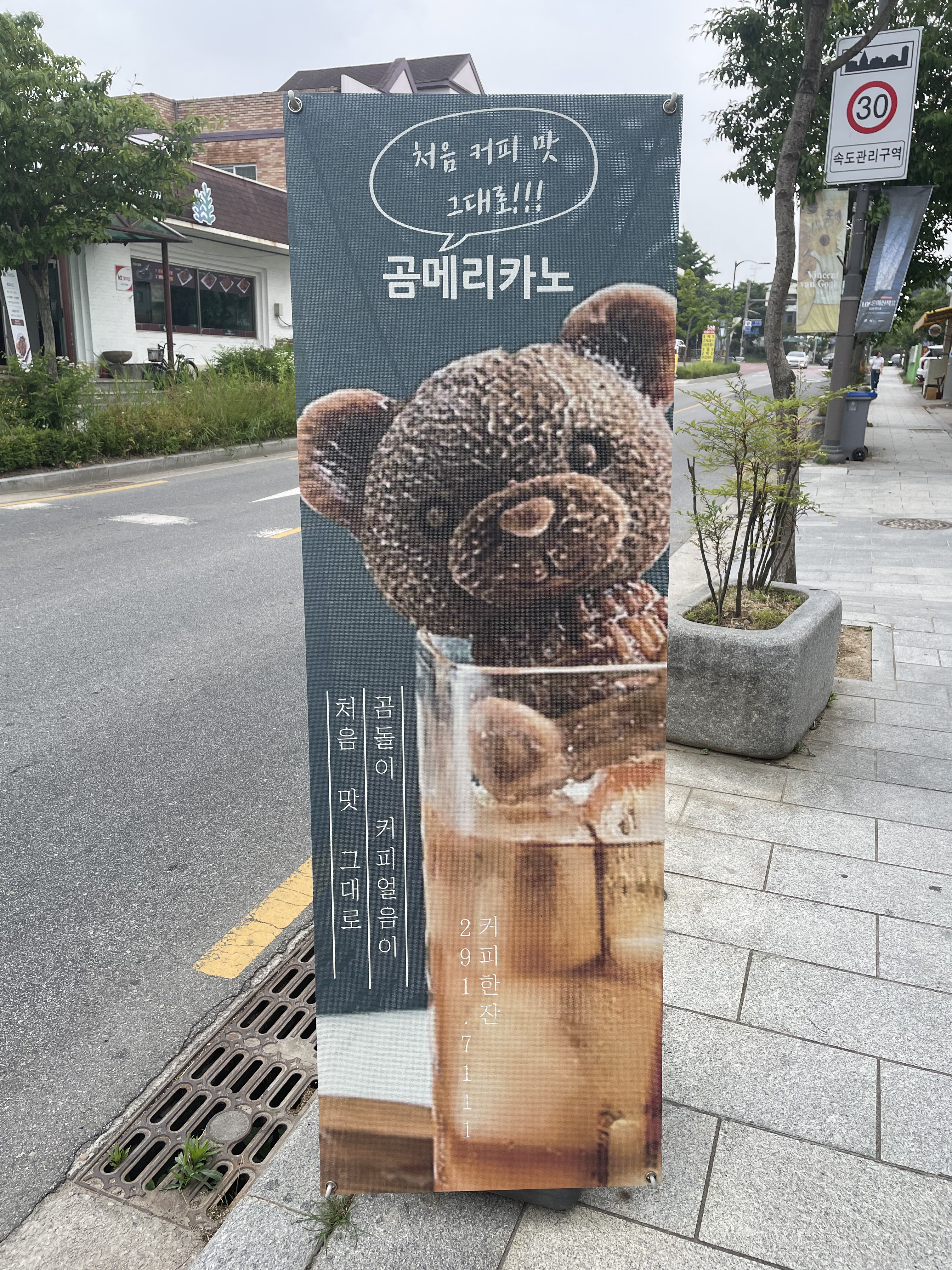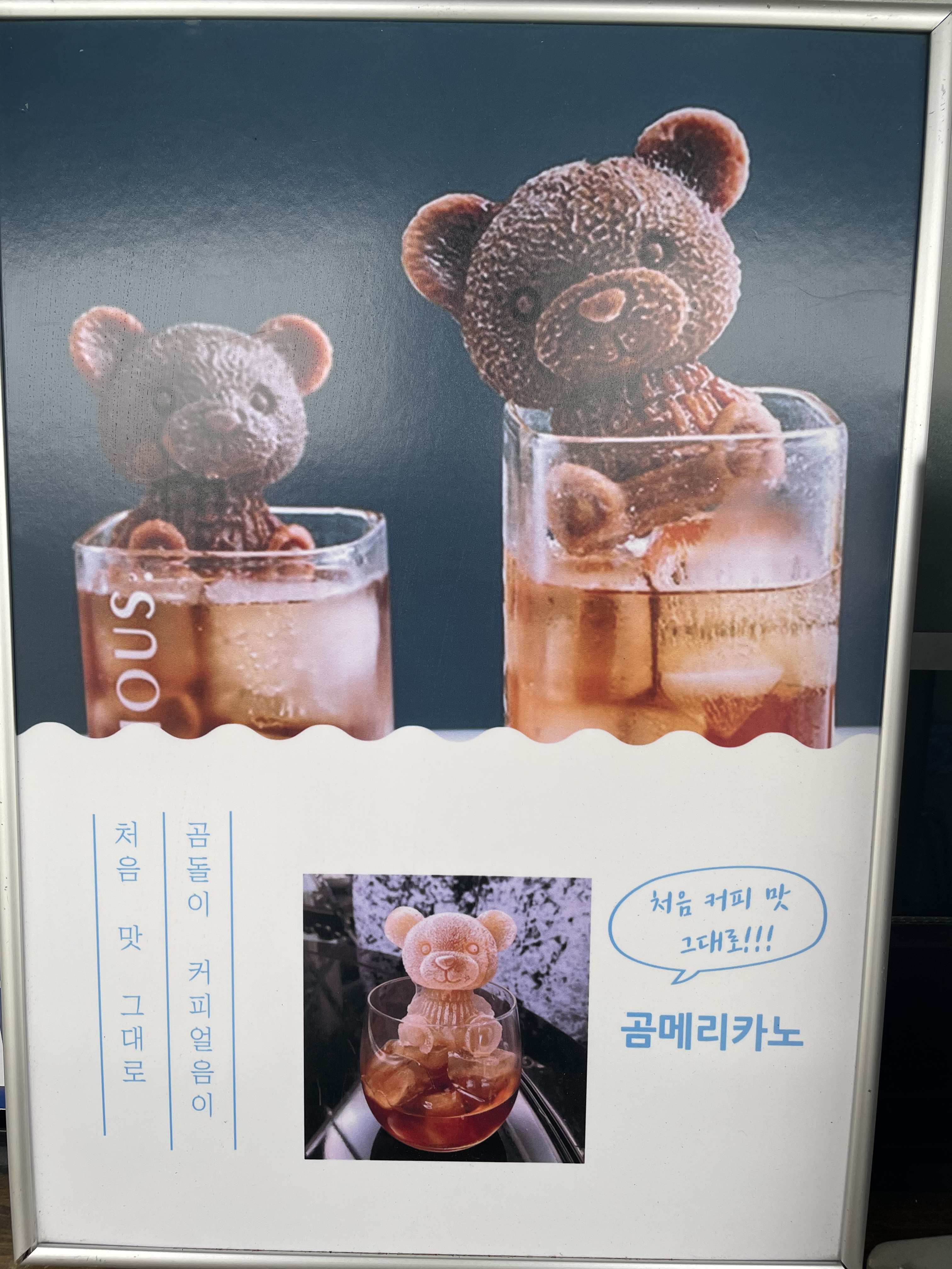 제가 이곳을 방문한 가장 큰 이유는 바로 '곰메리카노' 때문이었어요. 인스타그램에서 이 귀여운 곰돌이 얼음을 보고 이건 꼭 마셔봐야겠다고 생각했거든요. 실제로 받아보니 사진보다 더 귀여워서 심장이 아팠답니다. 🐻